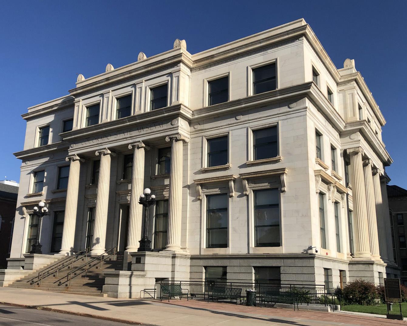 Next door to the First Baptist Church is the Colorado State Museum Building, noted for its impressive white marble exterior with fluted columns composed of Colorado’s State Rock, the Yule Marble (Figure 5). This building was constructed in 1916 during a time of active production at the Yule quarry, located about 60 miles south of Glenwood Springs near the town of Marble, Colorado. The parent rock for the Yule is the Mississippian-aged Leadville Limestone, which was transformed to marble about 12 Mya through contact metamorphism during the emplacement of the Treasure Mountain Laccolith. The quarry has sourced stone for buildings throughout the United States including the Lincoln Memorial and Tomb of the Unknown Soldier. Quarry operations shut down at the beginning of WWII but resumed 50 years later and is still active today. The operator, Colorado Stone Quarries, has recently opened a modern finishing plant in Delta, CO where the marble is processed to supply an active market for stone countertops and tile.