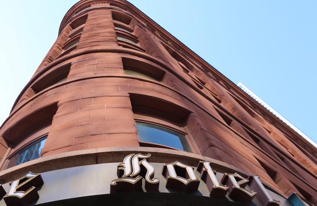 FIGURE 1: The Brown Palace Hotel: When it was completed in 1892, the Brown Palace Hotel was deemed one of the top three hotels in the US, and even appeared on the cover of Scientific American for its unique triangular design. The upper exterior floors are constructed with the Aztec Sandstone, a Jurassic-aged stone quarried in Arizona. (Photo courtesy of Nancy Sobel)