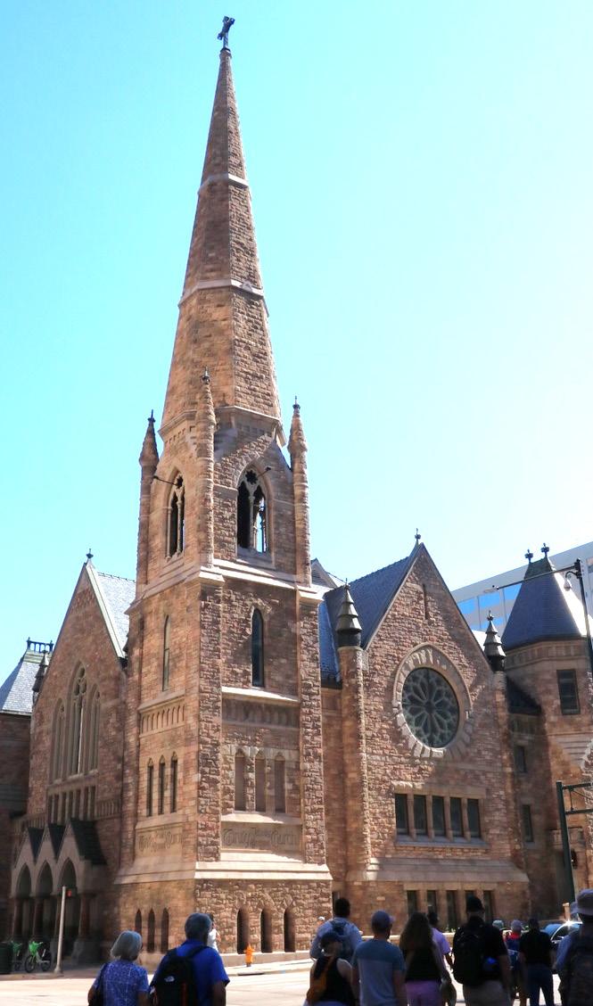 FIGURE 8: Stories in Stone Field Trip participants headed to the Trinity Methodist Church on Broadway and 18th Street. The church is constructed of Castle Rock Rhyolite, a building stone so strong and light that the 181’ hexagonal steeple was built with no internal bracing. (Photo courtesy of Nancy Sobel).