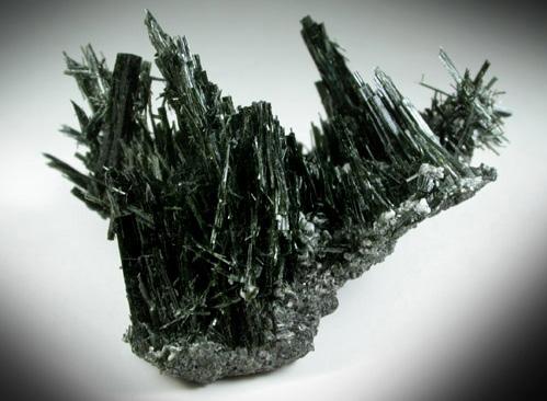 Radiating sprays of dark green actinolite in a chlorite greenschist from the Green Mountains, Chester, Vermont. Note the NW-SE trending crystal to the left of center is kinked. Sample is ~6 cm in long dimension. Photo by Ronald L. Parker.MINERAL OF THE QUARTER: ACTINOLITE