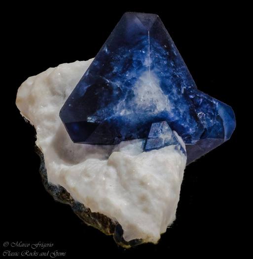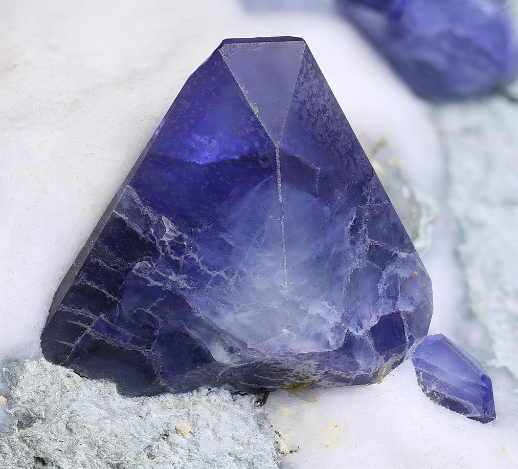 A stunning gem-quality triangular pyramidal benitoite crystal on a natrolite matrix from the California State Gem Mine, Santa Rita Peak, San Benito County, California, USA. This specimen is approximately 8 mm in height. The crystal form perfectly illustrates features of the ditrigonal-dipyramidal crystal class (bar6m2). Photo used with permission from Diego Savard of PHD Minerals.