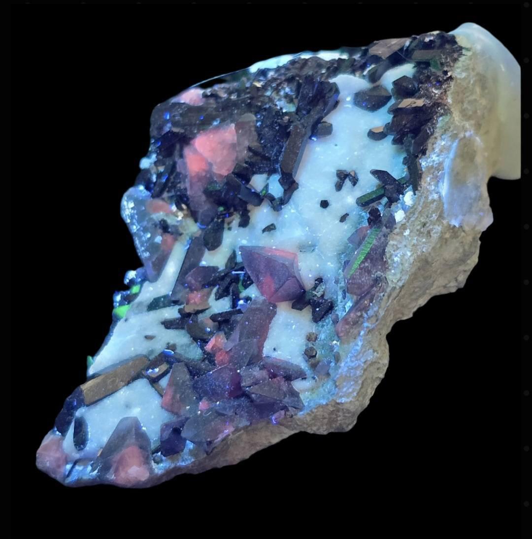 Left: Benitoite and neptunite crystals on a natrolite matrix. Under long-wave UV light, benitoite crystals fluoresce orange. They fluoresce skyblue under short-wave UV light. From San Benito County, California. Photo used with permission from Mathias Tonnaer, crystals2collect