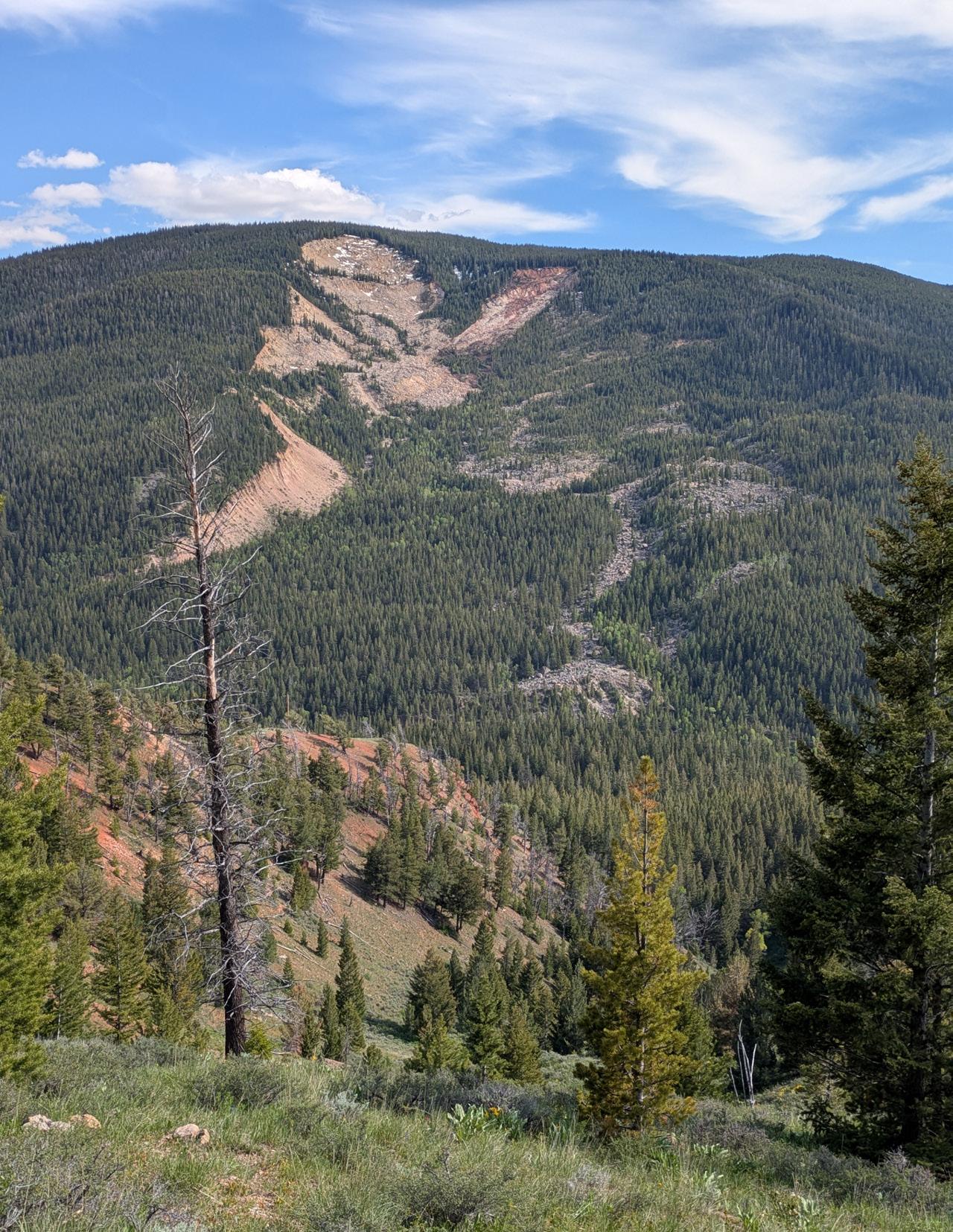 Photograph of the Gros Ventre Slide in June 2025, 100 years after it occurred. View is to the south from the north side of the Gros Ventre River Valley. Photo by James Mauch, Wyoming State Geological Survey. Read more on 14.