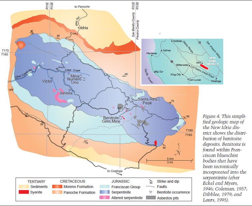 Map of the footprintshaped serpentinite diapir hosting the benitoite occurrences, San Benito County, California. Figure 4 from Laurs et. al., 1997.