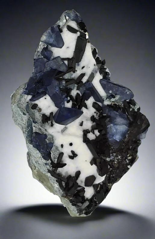 Blue trigonal benitoite crystals and elongate neptunite crystals on a matrix of natrolite from San Benito County, California. Photo used with permission from Mathias Tonnaer, crystals2collect.