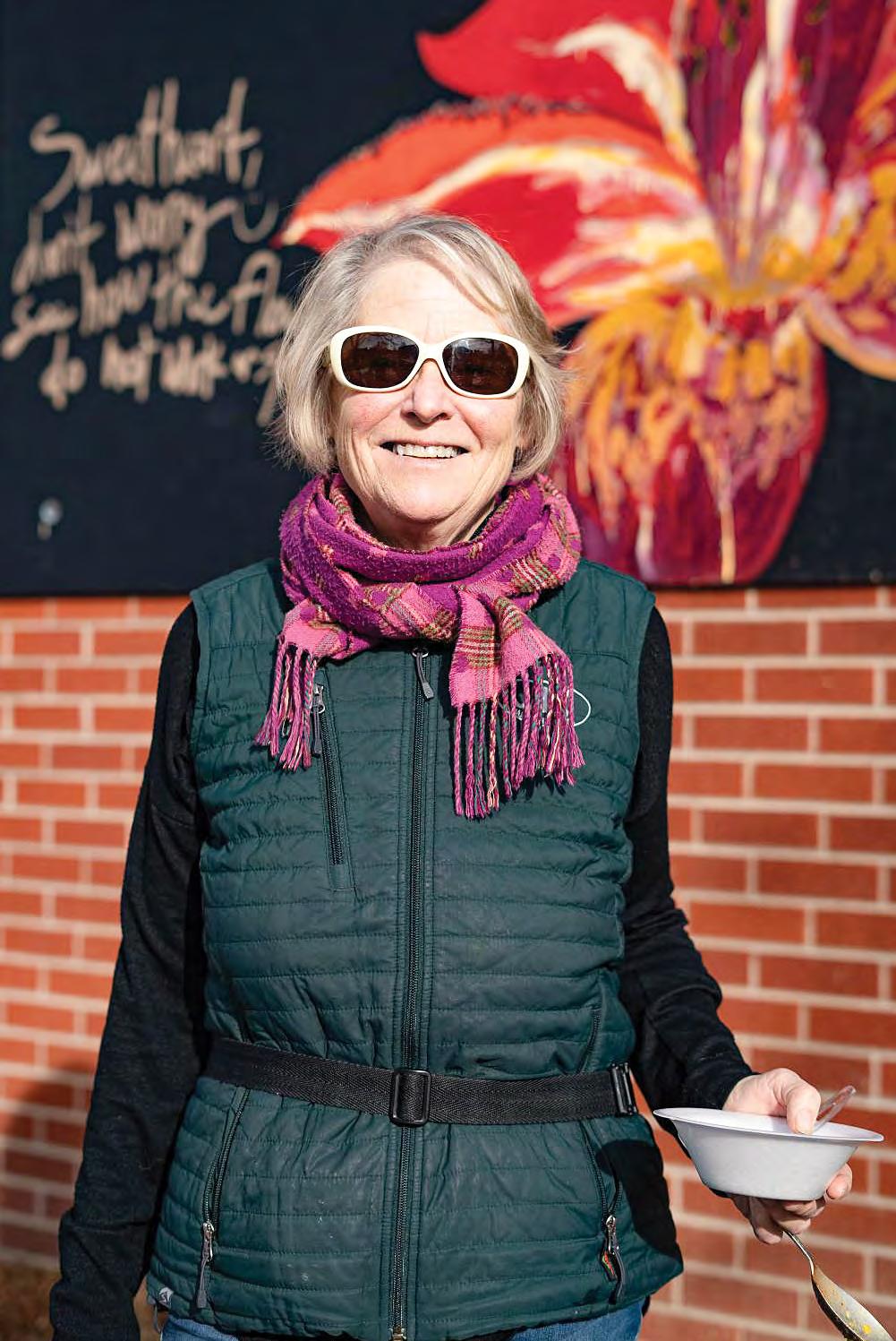 Deb James, a volunteer with Food Not Bombs, stands outside of Fort Collins Mennonite Fellowship where she helps to distribute food to community members. “It’s mutual aid, and we just take the power to make food individually and bring it here and serve it to individuals,” James said. No one’s in charge. There’s no sign up. There’s no committees. We don’t have meetings. We just come and feed people and every week is different. You don’t know who’s going to come to be fed, or who’s going to come to feed but it always works out in a beautiful way. And it feels powerful.”