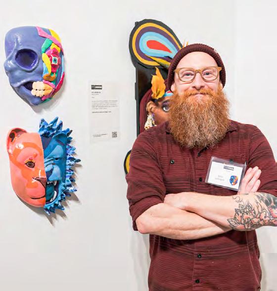 Dave Colangelo with his artwork, Mask Anatomy 101, during the opening night of the Masks exhibition at the Museum of Art Fort Collins March 3. “I’m an occupational therapist, so in school, I studied anatomy and physiology and had to learn all the ins and outs of the human body,” Colangelo said. “I don’t use any of that now, really, but I was always inspired by the art that these doctors and these artists put into these textbooks, so I did kind of a humorous take on what a face would look like: fake muscles — with a little bit of real muscles — and silly colors.” Colangelo has been a contributor to the exhibit for six years and spent two months on this year’s mask.
