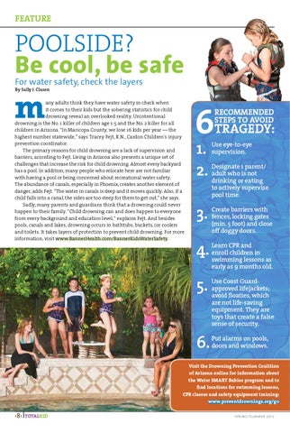 any adults think they have water safety in check when it comes to their kids but the sobering statistics for child drowning reveal an overlooked reality. Unintentional drowning is the No. 1 killer of children age 1-5 and the No. 2 killer for all children in Arizona. “In Maricopa County, we lose 16 kids per year — the highest number statewide,” says Tracey Fejt, R.N., Cardon Children’s injury prevention coordinator. The primary reasons for child drowning are a lack of supervision and barriers, according to Fejt. Living in Arizona also presents a unique set of challenges that increase the risk for child drowning. Almost every backyard has a pool. In addition, many people who relocate here are not familiar with having a pool or being concerned about recreational water safety. The abundance of canals, especially in Phoenix, creates another element of danger, adds Fejt. “The water in canals is deep and it moves quickly. Also, if a child falls into a canal, the sides are too steep for them to get out,” she says. Sadly, many parents and guardians think that a drowning could never happen to their family. “Child drowning can and does happen to everyone from every background and education level,“ explains Fejt. And besides pools, canals and lakes, drowning occurs in bathtubs, buckets, ice coolers and toilets. It takes layers of protection to prevent child drowning. For more information, visit www.BannerHealth.com/BannerKidsWaterSafety.