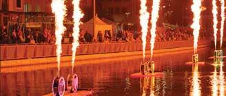 the interplay of light, sound and motion through the fire-shooting flotilla Fireflection In addition to creating a new, original art installation with nightly performances, Walter Productions has added a never-before-seen flame effect to this year’s shows.