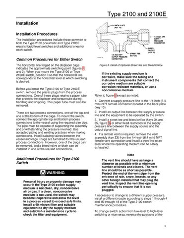 Type 2100 and 2100E Installation Installation Procedures The installation procedures include those common to both the Type 2100 pneumatic and Type 2100E electric liquid level switches and additional ones for each switch.