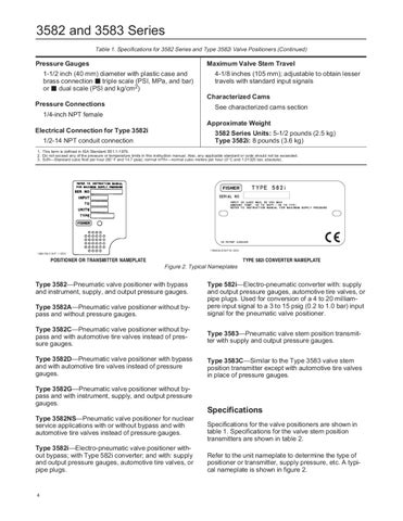 Specifications Specifications for the valve positioners are shown in table 1. Specifications for the valve stem position transmitters are shown in table 2. Refer to the unit nameplate to determine the type of positioner or transmitter, supply pressure, etc. A typical nameplate is shown in figure 2.