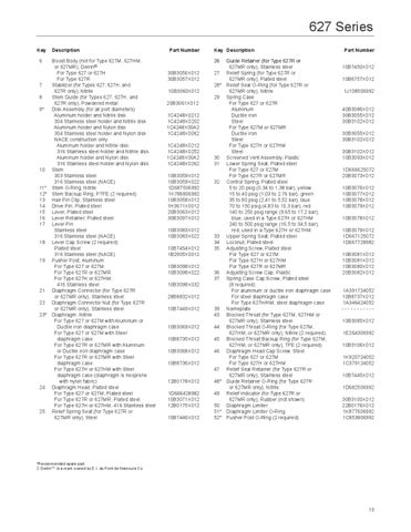Description Boost Body (not for Type 627M, 627HM, or 627MR), Delrin(2) For Type 627 or 627H For Type 627R Stabilizer (for Types 627, 627H, and 627R only), Nitrile Stem Guide (for Types 627, 627H, and 627R only), Powdered metal Disk Assembly (for all port diameters) Aluminum holder and Nitrile disk 304 Stainless steel holder and Nitrile disk Aluminum holder and Nylon disk 304 Stainless steel holder and Nylon disk NACE construction only Aluminum holder and Nitrile disk 316 Stainless steel holder and Nitrile disk Aluminum holder and Nylon disk 316 Stainless steel holder and Nylon disk Stem 303 Stainless steel 316 Stainless steel (NACE) Stem O-Ring, Nitrile Stem Backup Ring, PTFE (2 required) Hair Pin Clip, Stainless steel Drive Pin, Plated steel Lever, Plated steel Lever Retainer, Plated steel Lever Pin Stainless steel 316 Stainless steel (NACE) Lever Cap Screw (2 required) Plated steel 316 Stainless steel (NACE) Pusher Post, Aluminum For Type 627 or 627M For Type 627R or 627MR For Type 627H or 627HM, 416 Stainless steel Diaphragm Connector (for Type 627R or 627MR only), Stainless steel Diaphragm Connector Nut (for Type 627R or 627MR only), Stainless steel Diaphragm, Nitrile For Type 627 or 627M with Aluminum or Ductile iron diaphragm case For Type 627 or 627M with Steel diaphragm case For Type 627R or 627MR with Aluminum or Ductile iron diaphragm case For Type 627R or 627MR with Steel diaphragm case For Type 627H or 627HM with Steel diaphragm case (diaphragm is neoprene with nylon fabric) Diaphragm Head, Plated steel For Type 627 or 627M, Plated steel For Type 627R or 627MR, Plated steel For Type 627H or 627HM, 416 Stainless steel Relief Spring Seat (for Type 627R or 627MR only), Steel