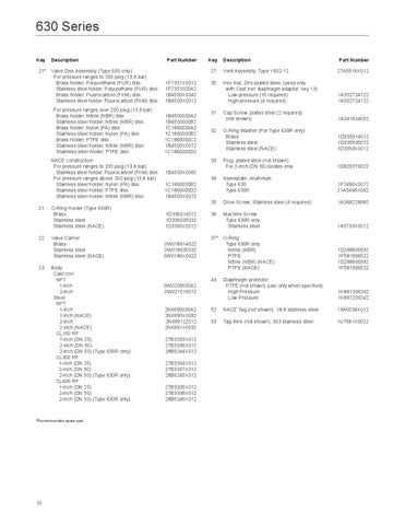 Description Valve Disk Assembly (Type 630 only) For pressure ranges to 200 psig (13,8 bar) Brass holder, Polyurethane (PUR) disk Stainless steel holder, Polyurethane (PUR) disk Brass holder, Fluorocarbon (FKM) disk Stainless steel holder, Fluorocarbon (FKM) disk For pressure ranges over 200 psig (13,8 bar) Brass holder, Nitrile (NBR) disk Stainless steel holder, Nitrile (NBR) disk Brass holder, Nylon (PA) disk Stainless steel holder, Nylon (PA) disk Brass holder, PTFE disk Stainless steel holder, Nitrile (NBR) disk Stainless steel holder, PTFE disk NACE construction For pressure ranges to 200 psig (13,8 bar) Stainless steel holder, Fluorocarbon (FKM) disk For pressure ranges above 200 psig (13,8 bar) Stainless steel holder, Nylon (PA) disk Stainless steel holder, PTFE disk Stainless steel holder, Nitrile (NBR) disk