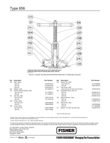 Description Groove Pin, steel Size 30 & 40 Size 60 Cap Screw, steel Size 30 & 40 (6 req’d), 60 (8 req’d) Handwheel body, cast iron Size 30 Size 40 Size 60 Body Extension, steel Size 40 Size 60 Groove Pin, steel Size 40 Size 60 Spacer, 416 SST (size 60 only)