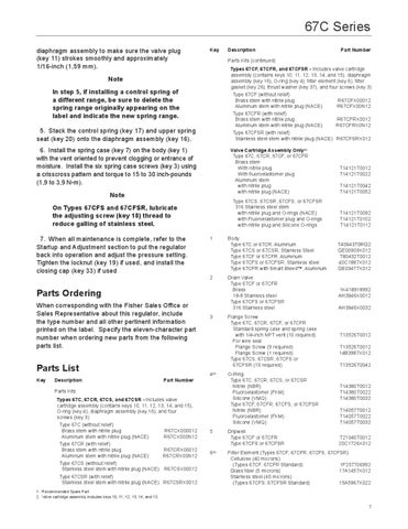 Parts Kits Types 67C, 67CR, 67CS, and 67CSR - Includes valve cartridge assembly (contains keys 10, 11, 12, 13, 14, and 15), O-ring (key 4), diaphragm assembly (key 16), and four screws (key 3) Type 67C (without relief) Brass stem with nitrile plug R67CX000012 Aluminum stem with nitrile plug (NACE) R67CX000N12 Type 67CR (with relief) Brass stem with nitrile plug R67CRX00012 Aluminum stem with nitrile plug (NACE) R67CRX00N12 Type 67CS (without relief) Stainless steel stem with nitrile plug (NACE) R67CSX00012 Type 67CSR (with relief) Stainless steel stem with nitrile plug (NACE) R67CSRX0012