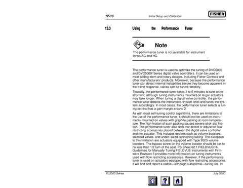 The performance tuner is used to optimize the tuning of DVC5000 and DVC5000f Series digital valve controllers. It can be used on most sliding-stem and rotary designs, including Fisher Controls and other manufacturers’ products. Moreover, because the performance tuner can detect internal instabilities before they become apparent in the travel response, valves can be tuned remotely. Typically, the performance tuner takes 3 to 5 minutes to tune an instrument, although tuning instruments mounted on larger actuators may take longer. When tuning a digital valve controller, the performance tuner detects the instrument revision level and tunes the system accordingly. In most cases, the performance tuner selects a tuning set that has a gain margin around 2. As with most self-tuning control algorithms, there are limitations to the use of the performance tuner. It should not be used on instruments mounted on valves with graphite packing at room temperature. The high friction of such packing causes severe stick-slip friction. The performance tuner also does not detect or adjust for flow restricting accessories placed between the digital valve controller and the actuator. This includes devices such as volume boosters, solenoid valves, and under–sized connecting tubing. The exception to this limitation are actuators equipped with Type 2625 volume boosters. The bypass screw on the volume booster should be set to no less than 1/2 turn of the seat. PS Sheet 62.1:FIELDVUE(H) Guidelines for Manually Tuning FIELDVUE Instruments with Firmware Revision 5 provides more information on tuning instruments used with flow restricting accessories. However, if the performance tuner is used on actuators equipped with flow restricting accessories, it will find and report a stable—although suboptimal—tuning set. In VL2000 Series