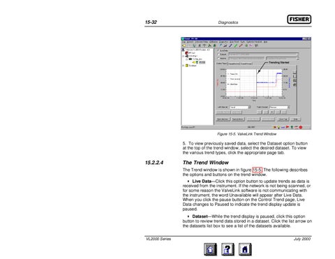 The Trend Window The Trend window is shown in figure 15-5. The following describes the options and buttons on the trend window. Live Data—Click this option button to update trends as data is received from the instrument. If the network is not being scanned, or for some reason the ValveLink software is not communicating with the instrument, the word Unavailable will appear after Live Data. When you click the pause button on the Control Trend page, Live Data changes to Paused to indicate the trend display update is paused. Dataset—While the trend display is paused, click this option button to review trend data stored in a dataset. Click the list arrow on the datasets list box to see a list of the datasets available.