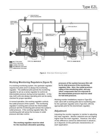 pressure of the system because this will be its inlet pressure if the monitoring regulator fails. Also, the outlet pressure rating of the monitoring pilot, and any other components that are exposed to the intermediate pressure must be rated for full inlet pressure. Working monitor installations require a Type EZL main valve with a working pilot and a monitoring pilot for the upstream regulator and a Type EZL with the appropriate pilot for the downstream regulator.