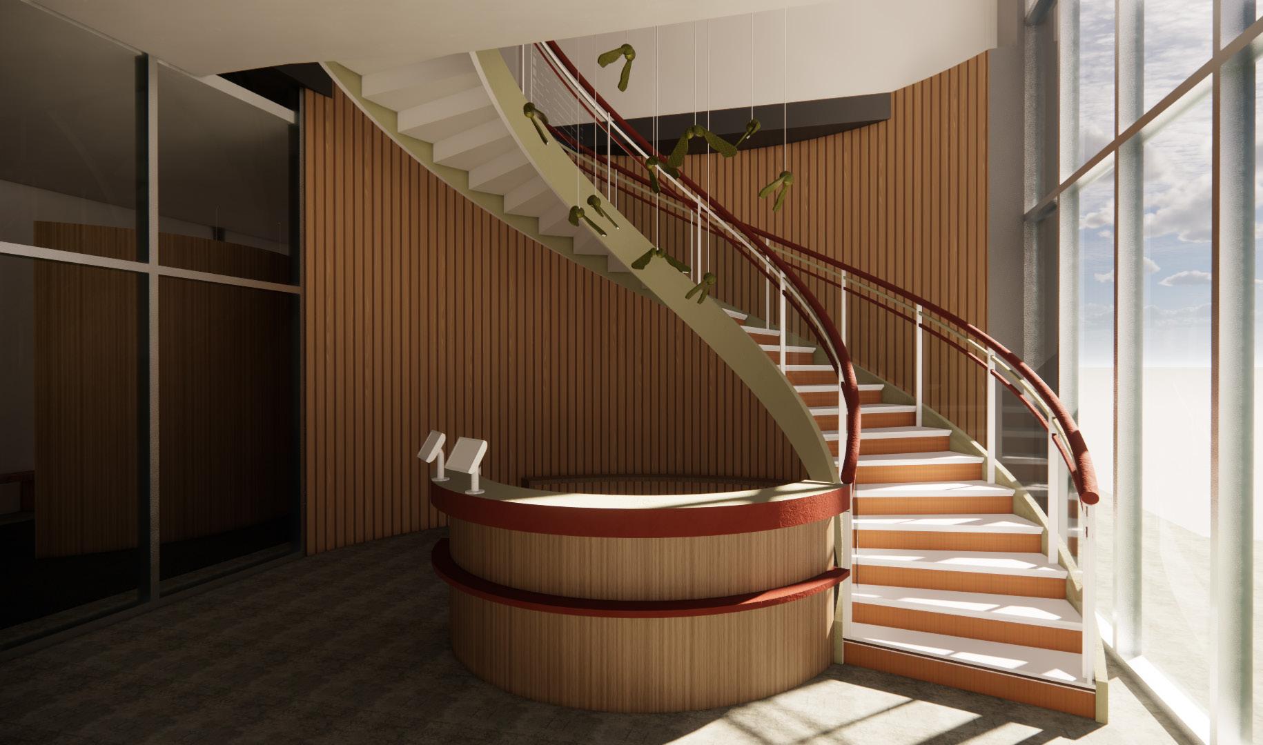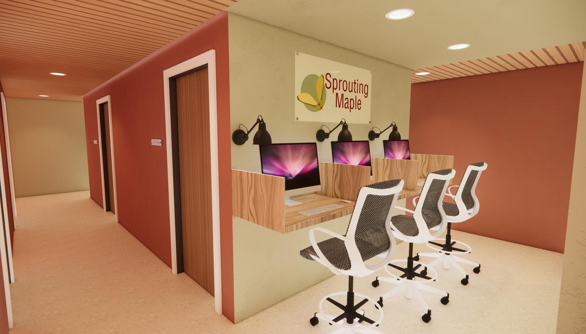 The neighborhood of Waltherson is a suburban area known for being kid-friendly and for creating community initiatives to teach children, along with the city of Boston, about native vegetation. Focusing on the native vegetation of Boston, inspiration for this project was taken from the Red Maple Tree. This tree is known for its vibrant red color change in autumn and for its “helicopter” seed pods that fall from the branches. The growth of the tree from seed pod to maturity is reflective of the growth of a child from infancy to adulthood. The goal of the Sprouting Maple Pediatric Clinic is to nourish patients in order to foster their growth. The goal of the facility as a whole is to provide spaces for nourishment, mind, community, and movement.