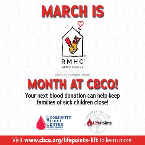 Charities of the Ozarks month at Community Blood Center of the Ozarks. LifePoints are earned by all donors and may be designated to a CBCO charity. If the March points were designated to RMHC of the Ozarks by April 5, CBCO TRIPLED the value of LifePoints to benefit our children and families!