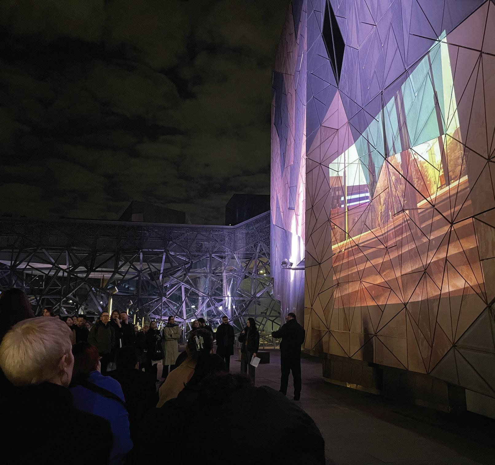 wove a speculative narrative live, while the world of Future Naarm: First Light was projected on Federation Square’s facade through real-time gameplay. Presented at Melbourne Design Ween 2025 ‘On Route’ event hosted by Architectus. Image: Architectus
