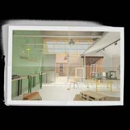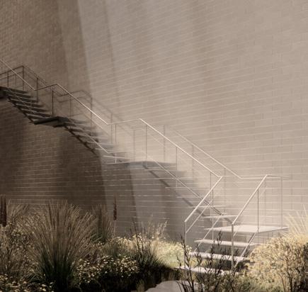 The upper-level living spaces feature typical tenement house external concrete walls and windows, while the lowerlevel co-working spaces use profilit glass walls to foster welcoming interactions with the public and surroundings.