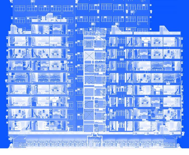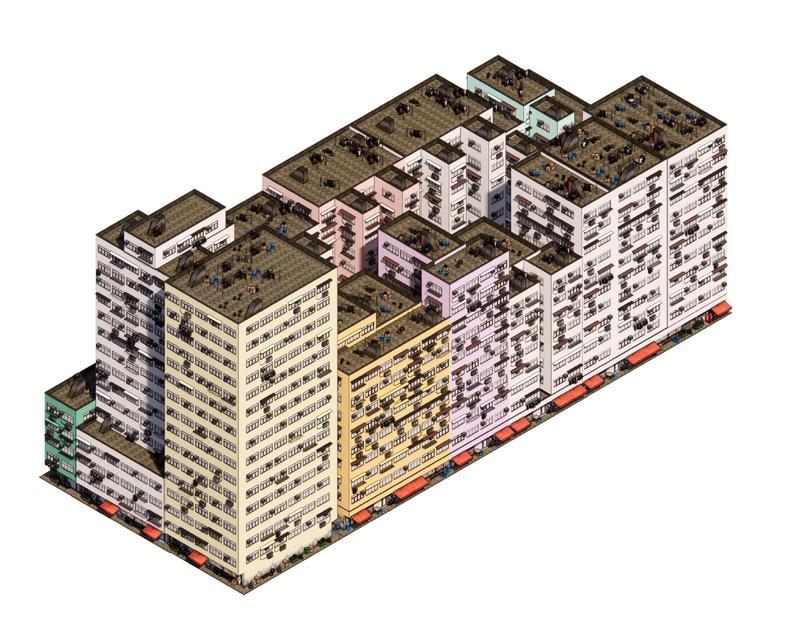 Acknowledging Hong Kong's housing history, I designed circulation and stairways referencing different periods of public housing estate plans but with a more three-dimensional approach. The new extended spaces are enclosed with mesh surfaces, creating a transparent and loose utilization of space in this co-working and co-living building.