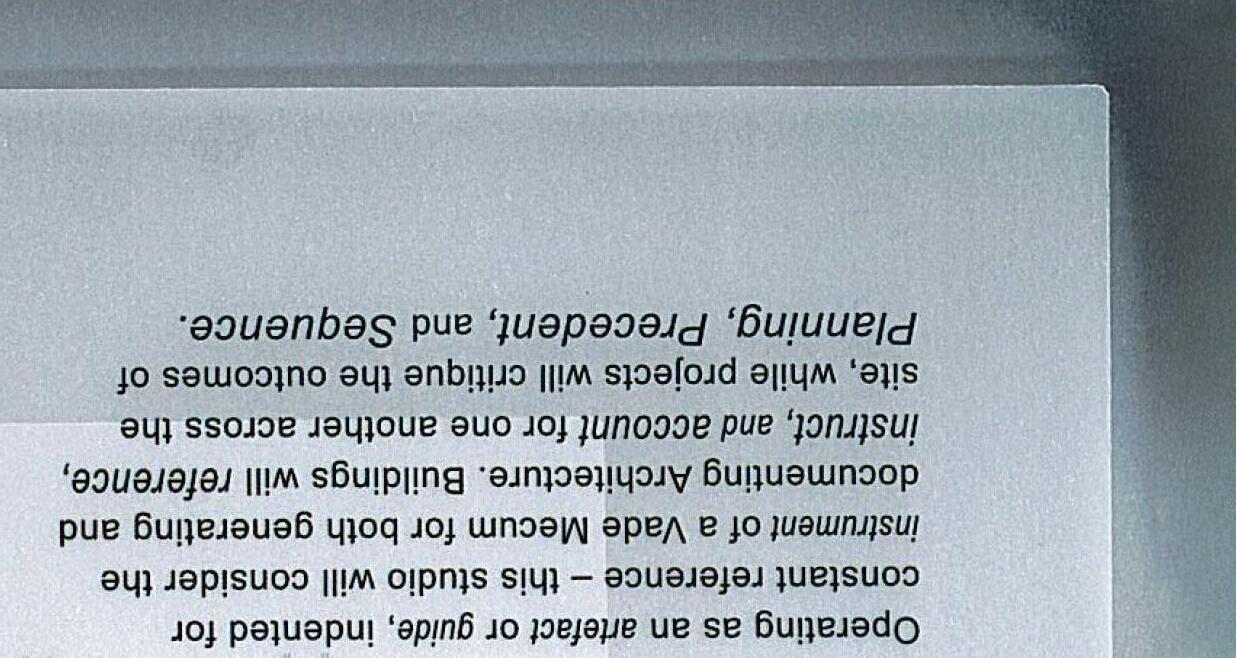 The studio will be undertaking investigations into the memory of place and how this informs a language of place. Students will be exploring a number of design methodologies, design tools, in order to understand the formal nuances of place, context. The role of the architectural precedent will be explored rigorously understanding the various languages that come with building typologies. These methodologies will be implemented for students to design a place of civicness that challenges preconceived notions of what might be initially understood formally.