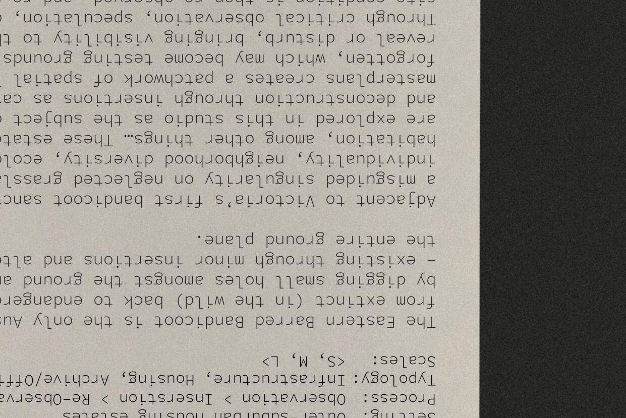 This studio is a proposal for an architecture that assists a nascent economy, re-texturising a for non-human advocacy, a constellation of emergent approaches and old bricks, it’s about smuggling catharsis into parliament and proving that architecture too, might be sentimental.