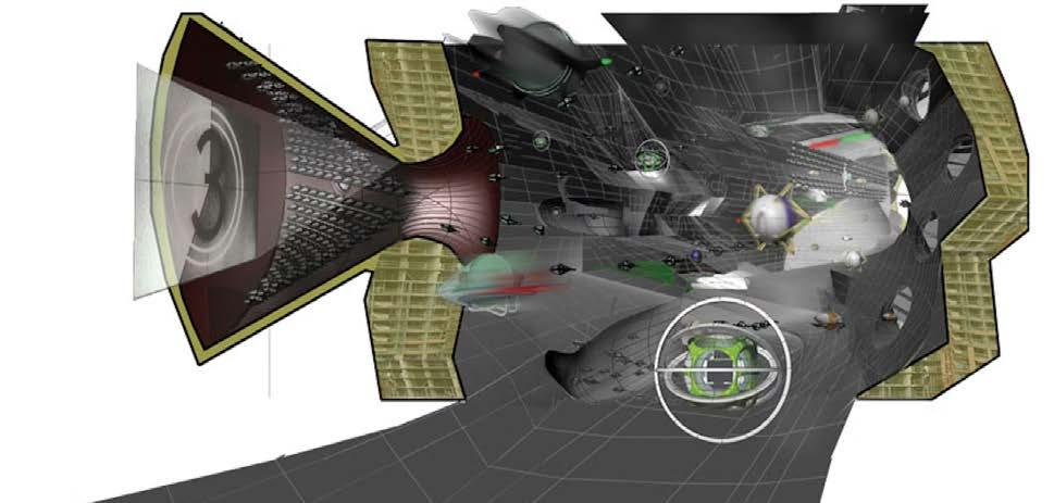 How is a truly three-dimensional city navigated, negotiated, and inhabited? What hierarchies, priorities, and con icts emerge within volumetric circulation? Which spaces stabilise a city de ned by constant motion? Must such an environment operate through rigid orbital schedules (planets), or can it accommodate distributed, individualised agency (anarchy)?