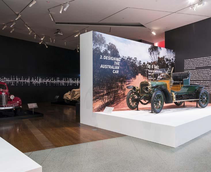 Next page Installation view of the Shifting Gear: Design, Innovation and the Australian Car exhibition showing the Tarrant two-seater roadster 1906 and partial views of the 1938 All-Enclosed Coupe on a Pontiac chassis (left) and the Coupe Utility on a 1934 Ford chassis (right).