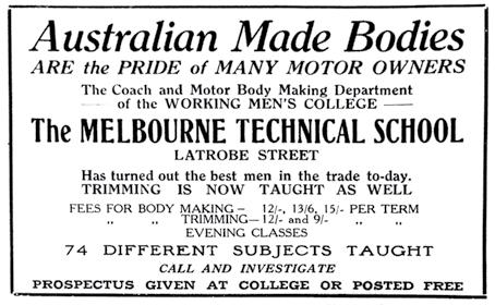 The Working Men’s College established automobile body building classes under instructor Edward Carlton in 1905. Advertisements for the courses appeared regularly in The Australasian Coachbuilder and Wheelwright