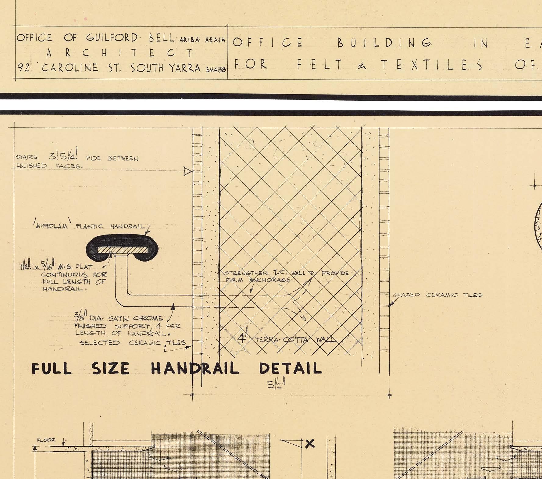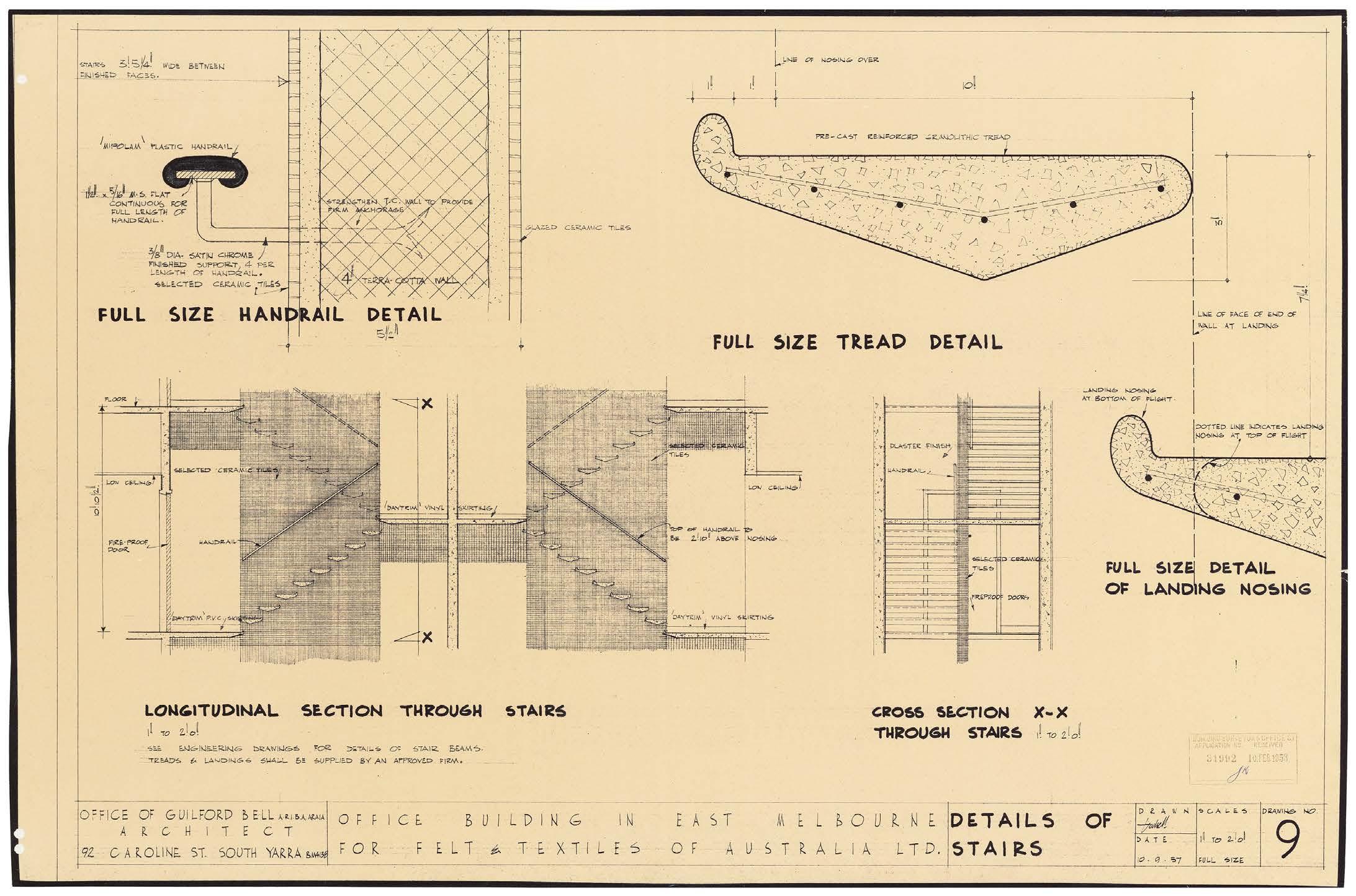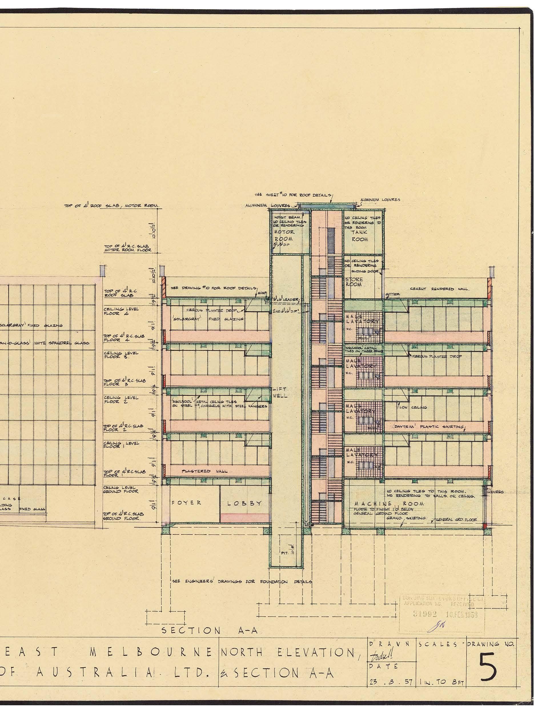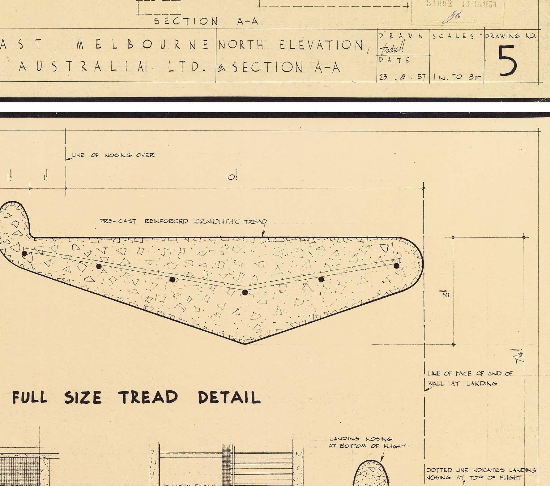 Below David Godsell and Office of Guilford Bell, Feltex House, North elevation, section and stair details, 1957. Public Record Office Victoria