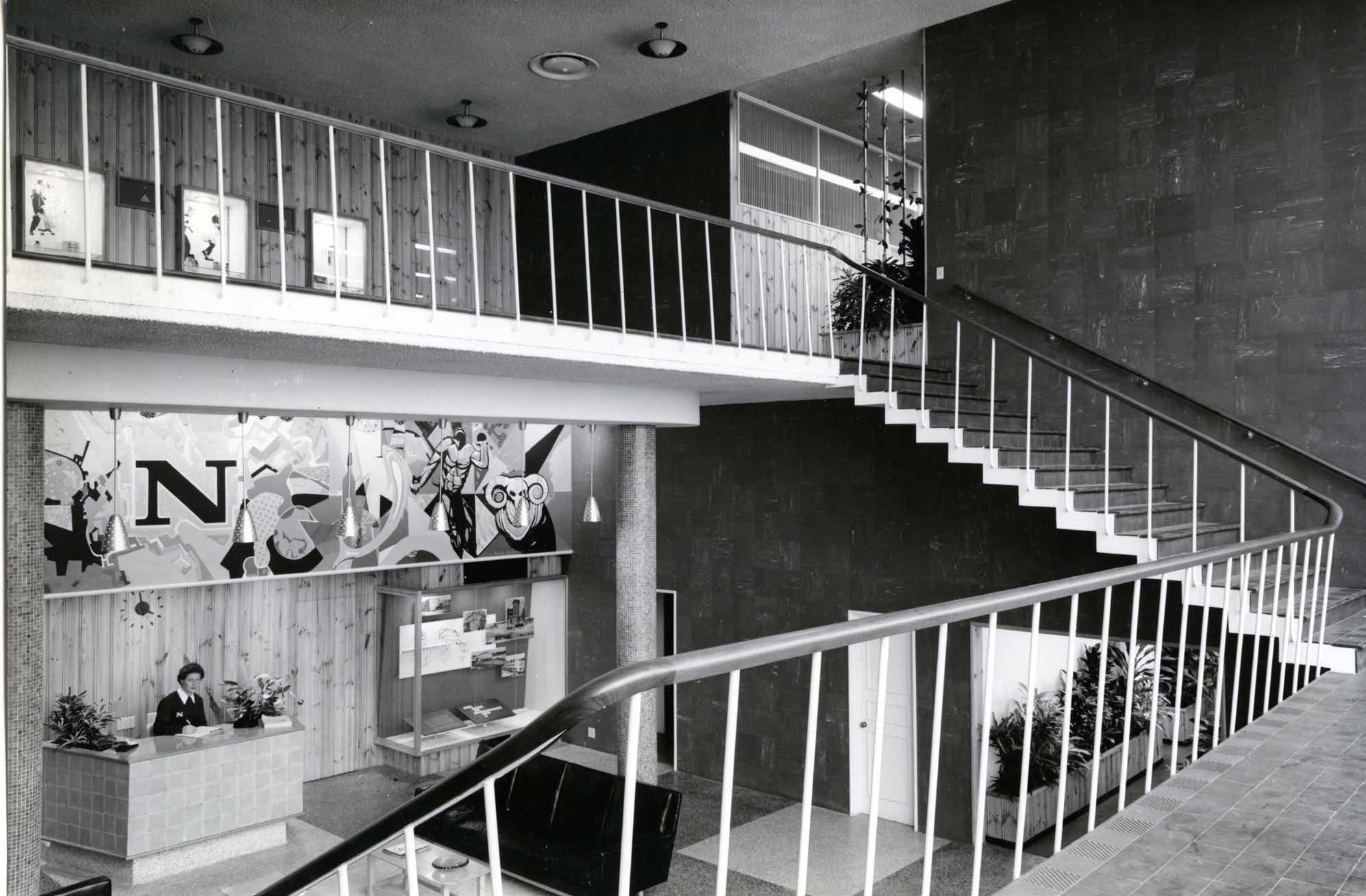 Top Entry lobby and reception, Nicholas Factory, Chadstone, 1956–7 Mural, Wesley Penberthy, Architect, D. Graeme Lumsden, Photographer unknown, University of Melbourne, Architecture Library, Cross Section Archive