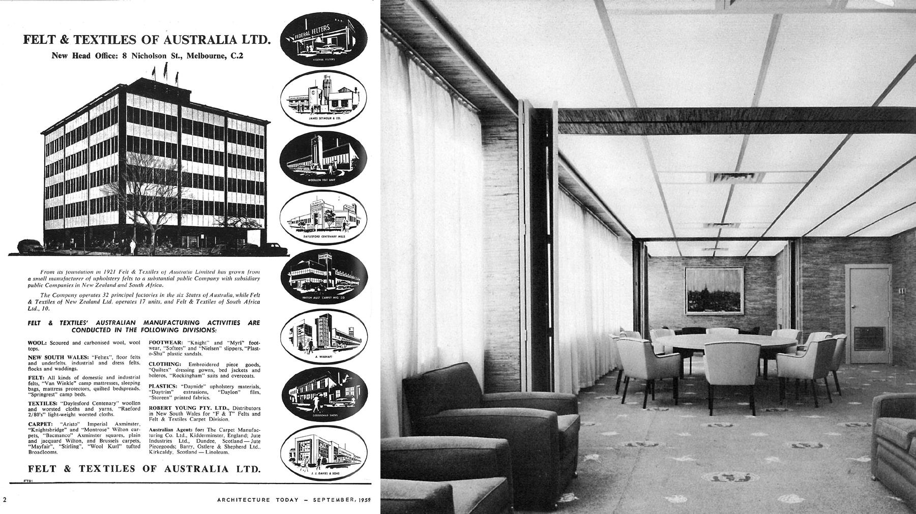 Giorgio Marfella, by contrast, focuses on the design of the headquarters of another major textile manufacturer, Feltex on the edge of central Melbourne. Feltex was “one of the largest Australian-owned manufacturing corporations, controlling a network of subsidiary wool and textile manufacturing companies with 7,000 workers and 65 factories in Australia, New Zealand and South Africa.”