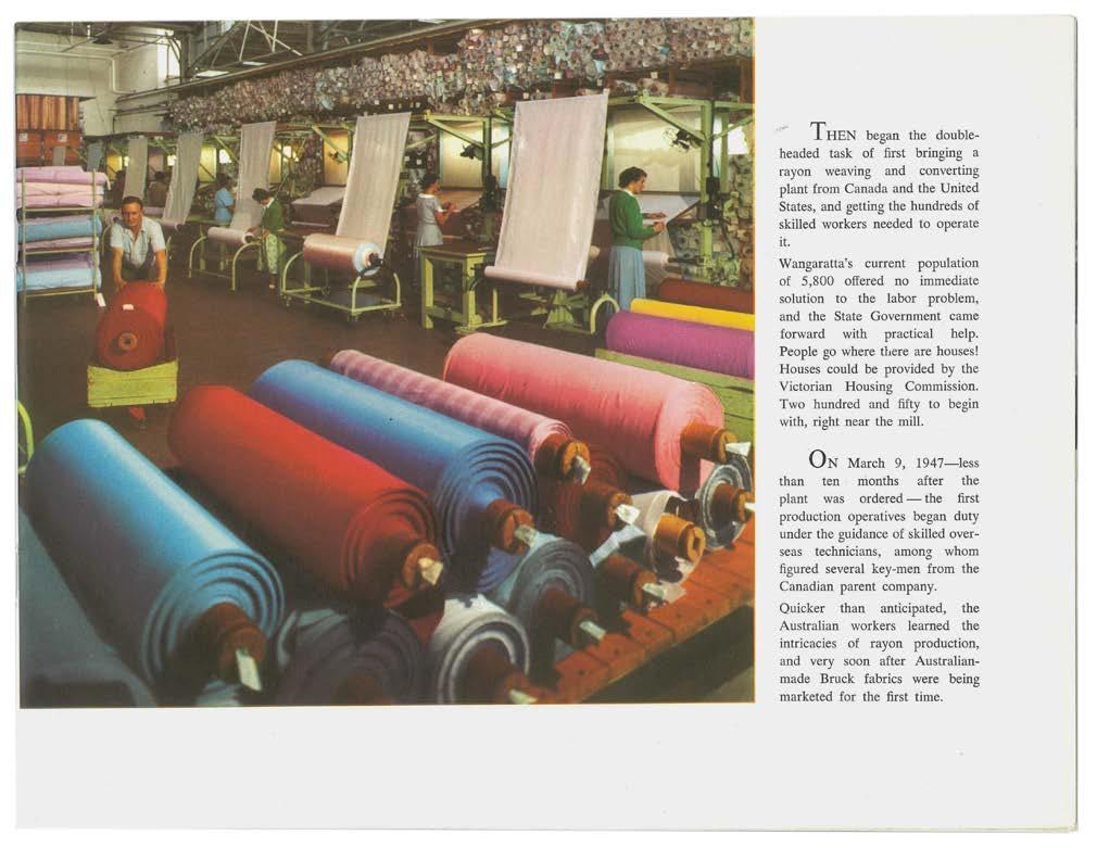Vicars also mentioned a third company, Bruck Mills (Aust.) Ltd., recently established and about to open its rayon weaving and finishing plant in the former Aluminium Security factory at Wangaratta in northeast Victoria, 236 kilometres from Melbourne. Again, there was an overseas connection, the company was starting business in association with Bruck Silk Mills Ltd. of Canada. Vicars noted the regional locations of each of the three mills, pointing towards a rationale of “avoiding the shortage of female labour existing in all big cities and taking advantage of its availability in country areas.”43 The textile industry had always been a strong employer of women and after World War II, the shortage of female labour was felt to especially acute. Vicars noted that “really good conditions will assist greatly” but added that: