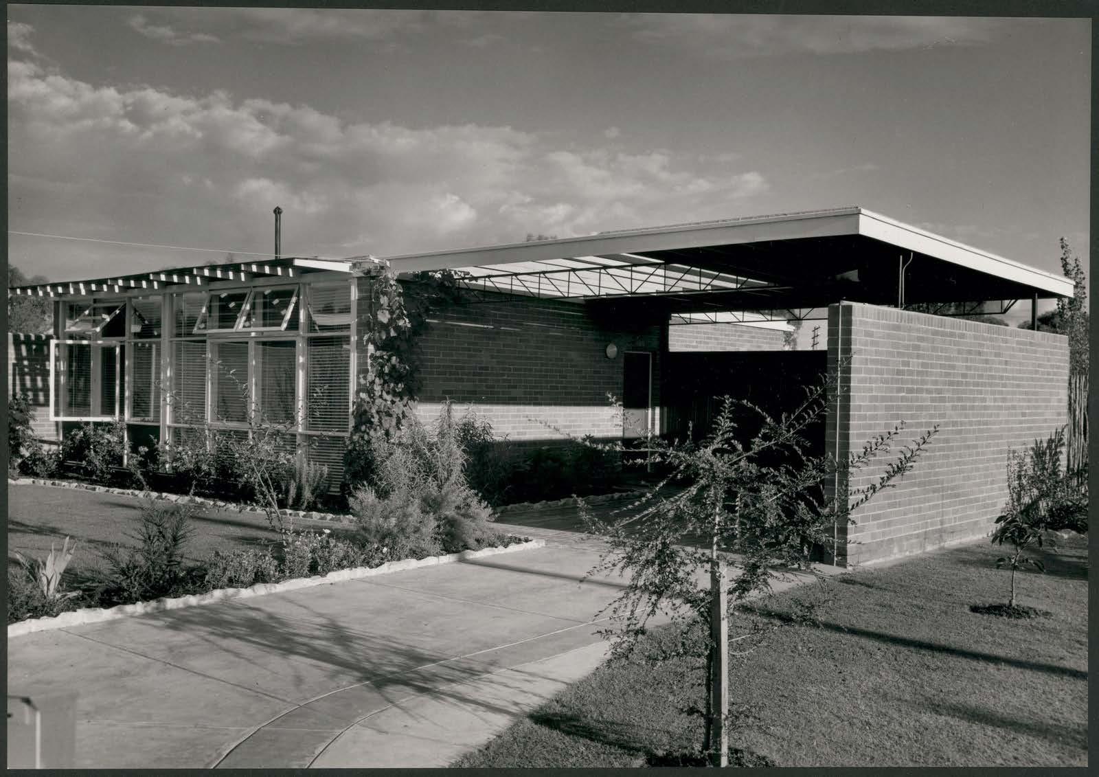 To assist the development of Bruck’s presence in regional Victoria, the State Government promised for Bruck’s workers 250 homes to be constructed in two years by the Housing Commission of Victoria. By the beginning of 1953, 450 houses had been built and another 150 prefabricated houses were in process. Private building and co-operative societies erected between 600 and 700 more houses and the Commonwealth migrant hostel housed 200 New Australians and later 60 British families. Extra accommodation for migrant workers was found in the town’s old army barracks. For its administrative manager, Stanley M. Arms, who’d moved from Melbourne in 1947 to take up the position, a low-slung gable-roofed and weatherboard house typical of Boyd’s 1947 description of the Victorian Type and designed by Melbourne architect L. Hume Sherrard was erected at 21 Vernon Road, Wangaratta in 1953.55 In addition, Bruck completed for its top technicians between 1953 and 1956 in Bruck Court, a row of five contemporary single-storey modern houses designed by Grounds, Romberg & Boyd and at 11–15 Bruck Court, ‘Bruck House’, a special double-storey accommodation and entertainment facility for visiting dignitaries and company executives.56 The single storey houses had modular timberframed Stegbar window-walls facing the street and rear walls similarly divided – domestic interpretations of the aluminium glazed curtain wall. The roof plane continued seamlessly from house to covered carport/lanai and pergola, all supported off open-web steel girder trusses that floated above a brick screen wall. Landscape design