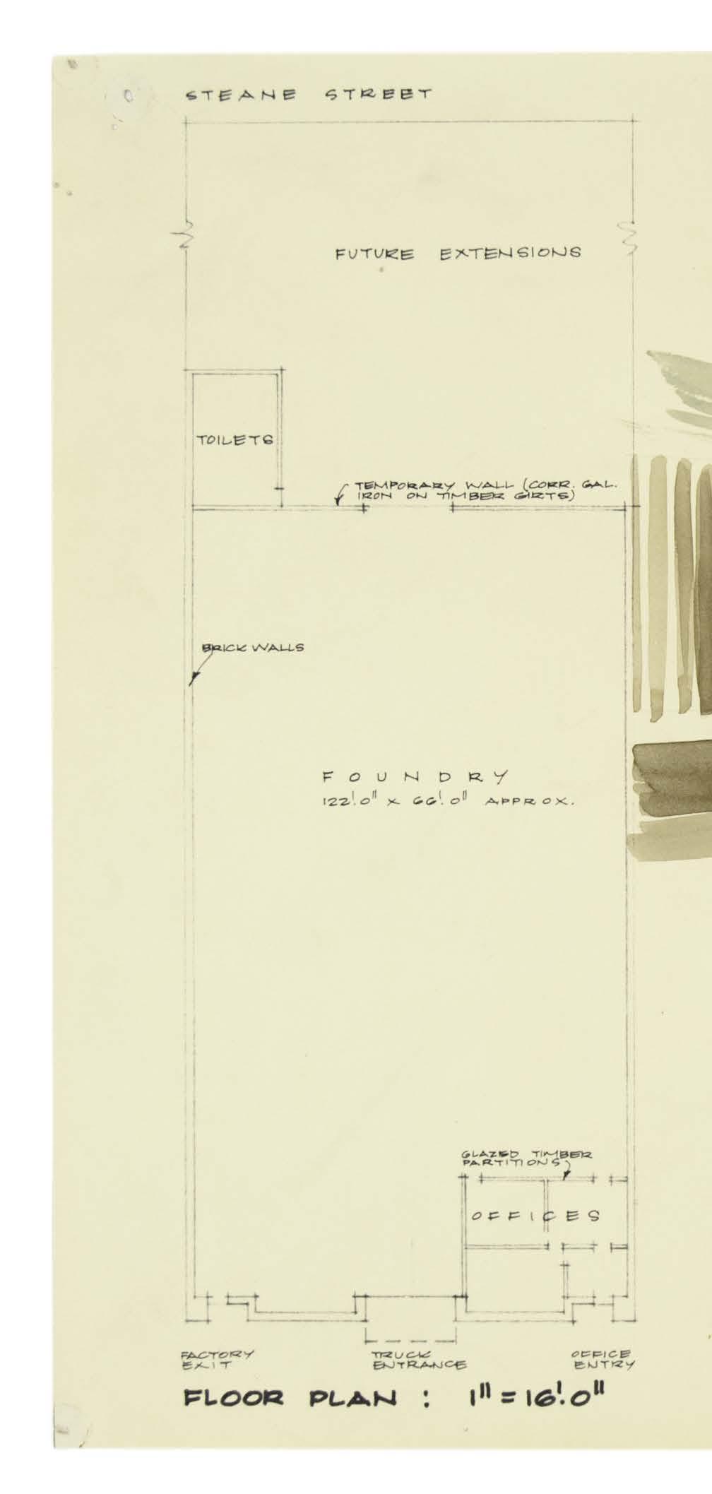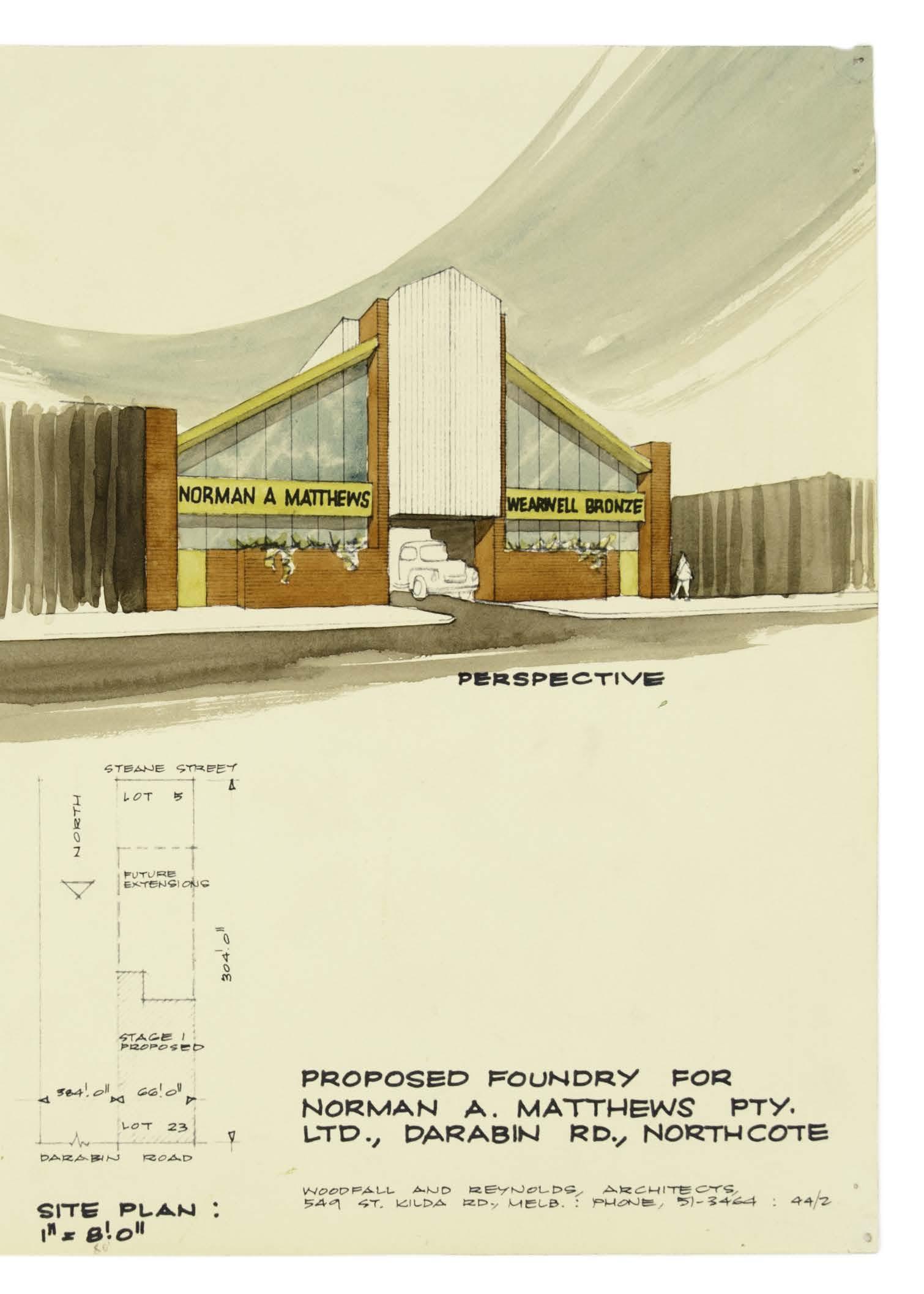 the factory buildings themselves. By contrast, in Victoria, post-war Wrightian adherents, Geoffrey Woodfall and David Godsell, celebrated for their landscape-sensitive residential designs, designed a number of small and medium-scaled factories. Like their houses, the forms of these factories were intended to evoke different ideas. Allusions were not to machines or the efficiency of curtain wall construction but instead to the search for a new language of texture and where applicable, empathy with the landscape. On a sloping site at outer suburban Notting Hill, for the factory for N&N Shopfitters (1963), Woodfall disposed a series of low pitched gable roofs framed in profile by stained timber fascias that marked administration, shop floor and warehouse that echoed distant views of the Dandenong Ranges. Raised garden-bed walls attached to the building’s front and a sweeping lawn imprinted its organic undertones. This same use of the factory roof as a compositional principle rather than something to conceal also informed Woodfall’s near monumental foundry premises for Wearwell Bronze Co. in Darebin Road, Northcote (1961). There, a single, much steeper gable was given monumental presence hard on the street with clinker brick piers and central pylon and roller door with tall flanking built-in planter bed walls – a composition worthy of the Griffins.