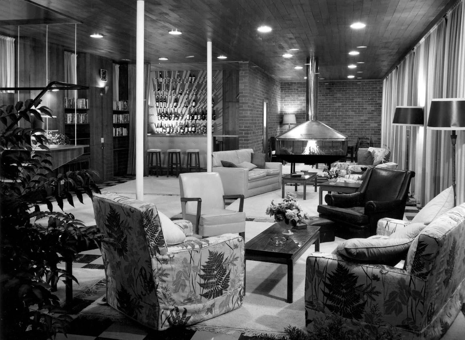 was undertaken by John Stevens.57 No fences divided the GRB-designed houses and Bruck House at the end of the cul-de-sac giving the feel and ambience of an idealised North American suburban sub-division: a miniature planned ‘suburb’. The technicians and executives could walk directly from their house onto the adjacent premises. As with the technicians’ houses, the double storey Bruck House was delineated back and front as a ‘curtain wall’ of glass and panel infill but framed in timber. It was as if the corporate glazed walls of the administration blocks of the outer suburban post-war factory had been transplanted to the domestic settings of those in administration. Inside, the ground floor of Bruck House was devoted to entertainment: it had a floor of chequerboard pattern of Nylex vinyl tiles, timber-lined ceiling, exposed brick and vertical timber-lined walls, and furnished with couches, sofas, standard lamps and Swedish rugs. The three architectural features of the long space were an open tread stair hung from the ceiling, an elevated open double sided fireplace with an exposed copper hood and flue that acted as a room divider, and in one corner, a lavishly stocked bar with its bottle perched on timber and dramatically lit from below. In the link between this lounge space and the billiard room (also on the ground floor) was a floor-to-ceiling photo-mural (presumably by Sievers) related to nature and fibre. Above was a caretaker’s flat and guest sleeping accommodation.