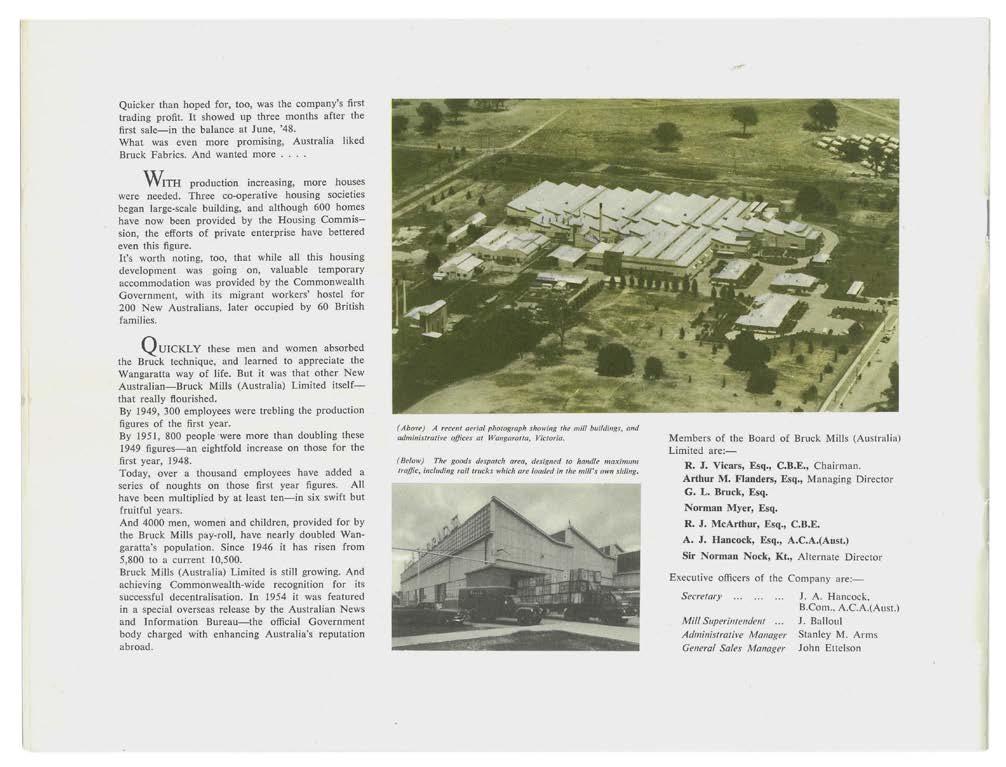 Bruck’s interest in Australia had emerged before World War II, in 1937, when Arthur M. Flanders, Vice President and Director of Bruck Mills Ltd of Canada had come to Australia to develop an export market for high fashion fabrics. War intervened but Flanders and his Montreal directors were convinced of the viability of an Australian operation and on 27 May 1946, Bruck Mills (Australia) Ltd. was incorporated under the Victorian Companies Act and by December, Bruck Fabrics had a home in country Victoria.45 On 9 March 1947, production began in Wangaratta.