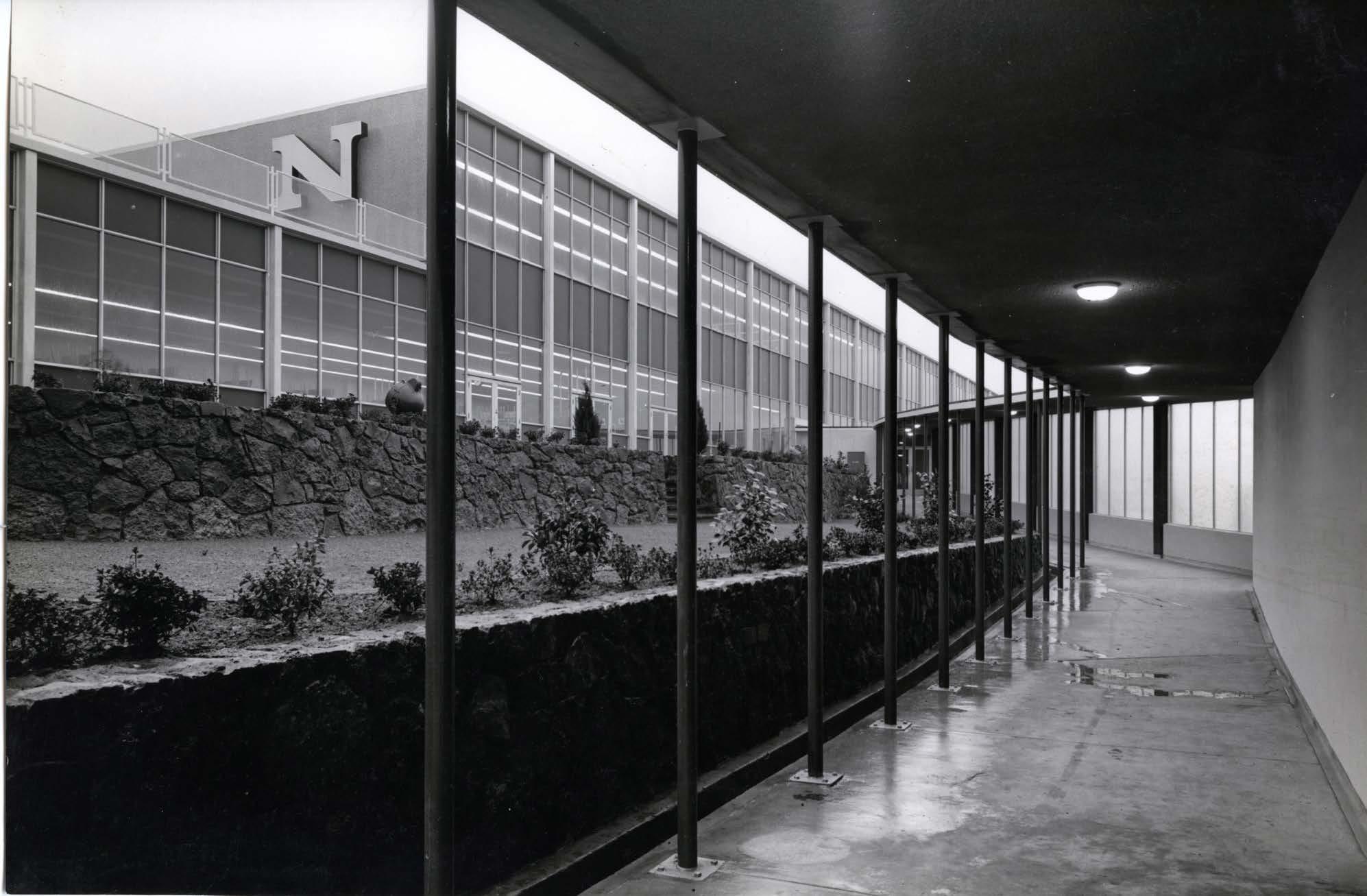 Opposite Covered entry way for factory staff, Nicholas Factory, Chadstone, 1956–7. Architect, D. Graeme Lumsden, photographer unknown, University of Melbourne, Architecture Library, Cross Section Archive