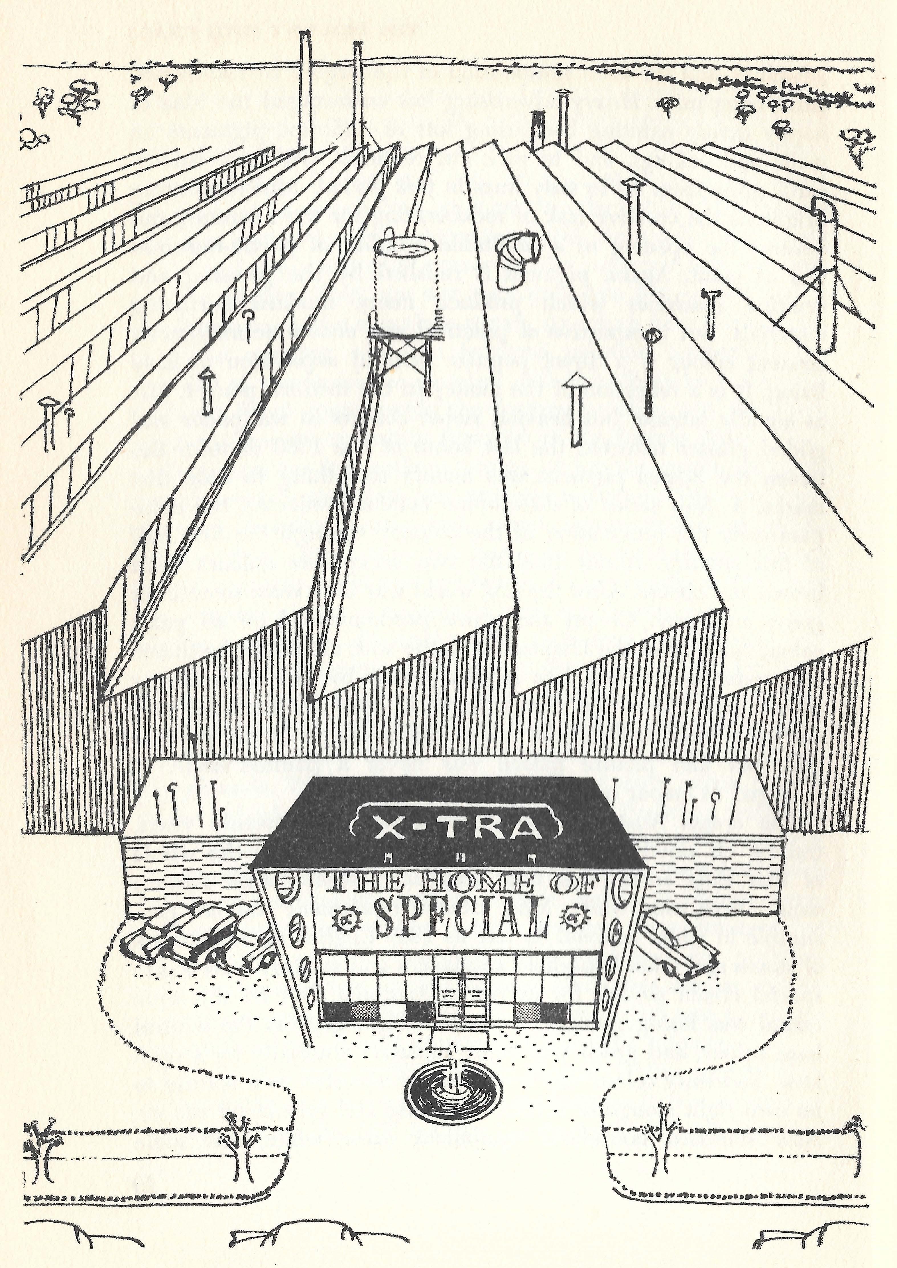 His drawing of ‘X-TRA – The Home of Extra Special’ had Holden Specials parked out front, a two-tone glazed wall, giant sign-writing (and even ‘X-TRA’ written on the jaunty angled and port holed roof structure) and limitless sawtooth roofscape behind littered with chimneys, flues, vent pipers and then an untouched agricultural landscape beyond to the horizon. If Boyd’s conclusions about the state of the design of manufacturing was largely accurate – if the dozens of factories featured in the journal Cross-Section from 1952 across Australia were any evidence to go by – there were notable exceptions. There was a cohort of architects especially adept at industrial architecture, including the large corporate firms of Hassell & McConnell, Harry A. and Frank L. Norris, Eggleston, MacDonald & Secomb and Buchan, Laird & Buchan but more notably, the office of D Graeme Lumsden (1915-1995), whose career over three decades was based largely around industrial architecture.18 and whose factory buildings in Melbourne’s outer southeastern suburbs Notting Hill brought a distinct sense of architectural élan to manufacturers like Volkswagen (Australia), Clayton (1958, 1966), Peters Ice Cream, Clayton (1962), Smith & Nephew, Notting Hill (1962) and Murfett Publishers, Moorabbin (1961) amongst others. Lumsden’s premises for Nicholas Pty Ltd (Aspro) (now demolished)