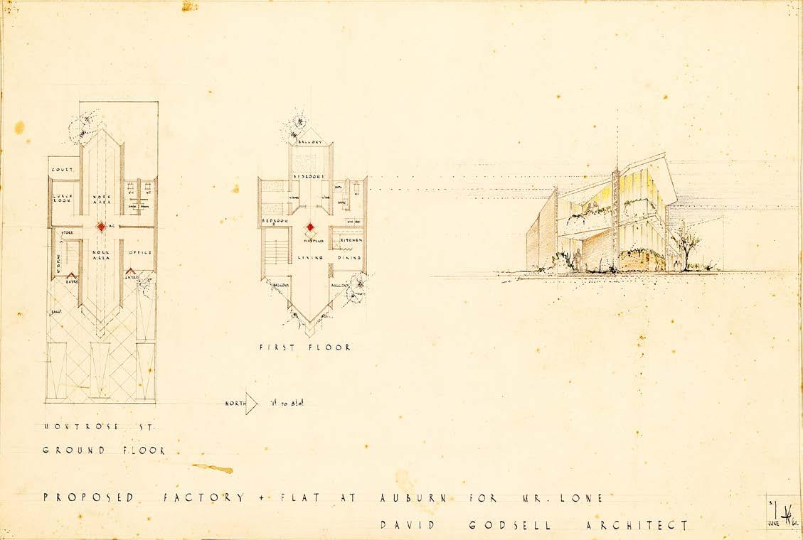 Godsell, like Woodfall, did the same in Bell Street, Preston for Steco Industries Pty Ltd in a design proposal (c1963) for a factory where trailers were manufactured.28 There, he emphasised a giant flat roof floating above a strip of horizontal glazing and a ground-hugging brick base. While at Cochranes Road, Moorabbin for the Bentley Manufacturing Company, Godsell’s unbuilt 1962 design employed the same boldly horizontal mansard factory roof in copper green with a three-storey pagoda-like office block edging above and repetitive lunette windows at eaves level.29 Comparable compositionally to Peter Muller’s Wrightianinspired factory for Victa Consolidated Industries at Milperra, NSW (1959), Godsell’s design would have been a unique addition to Melbourne’s manufacturing landscape. Godsell also designed a special form of placemaking, a tiny work-live facility in 4A Montrose Street (1962) in the middle-ring suburb of Auburn, for contact lens manufacturing company G Nissel & Co. (Aust) Pty Ltd, operated locally by Victor Lowe. Lowe and his business associate Gordon Douglas had studied precision optical manufacturing at Royal Melbourne Technical College and from 1954 their company developed a reputation for the optical quality of its contact lenses, becoming one of just four Australian contact lens manufacturing companies operating in the 1950s and 1960s.30 On the ground level, an air-conditioned linear workshop space with angled glass bays at either end was flanked by a stairwell and lunchroom on one side and on the other by an office and bathroom.