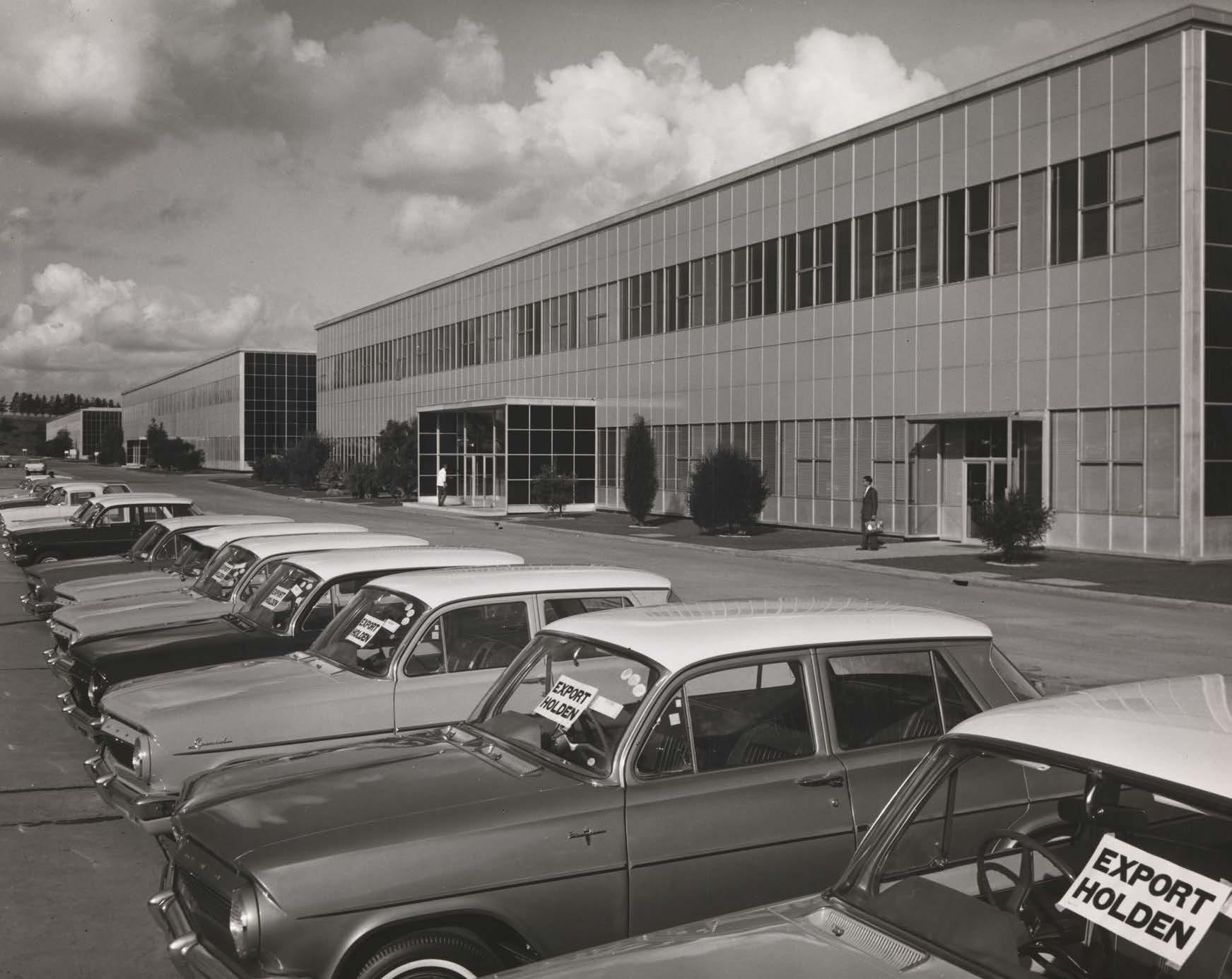 New cars outside General Motors Holden administration block (1956), Dandenong, Victoria, 1963