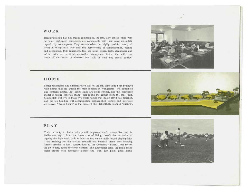 The arrival of Bruck Mills (Australia) in 1947 signalled Wangaratta’s rebirth. By 1953, the town’s population had doubled to more than 10,000. While noting initial local distrust behind the expansion, popular journal Pix claimed that “it has become one of the most prosperous towns in Australia. The reason for its prosperity is decentralisation”.51 The company had also become the largest post-war decentralised industry in Australia. A key issue facing the firm was the sourcing of a labour force and where to house them. While primarily an Australian company with Australian shareholders, its founder was Canadian, co-managing director Arthur M Flanders, who came out after the war, together with technicians and rayon experts from Canada and the United States. The mill employed local tradesmen as well as men and women, who’d moved with their families from Melbourne, and significantly a large proportion of migrants, many of them coming from the migrant hostels at Bonegilla, 80km north near Wodonga. In 1953, of a total of 800 employees, 200 were pointedly noted as being ‘new Australians’ in addition to ‘50 British migrants’. Recollecting the multicultural nature of the