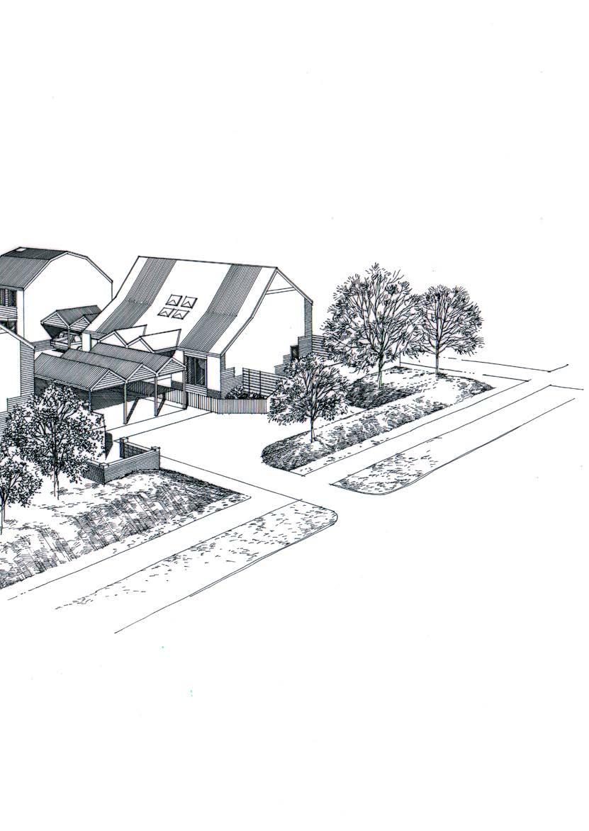 At a later project by Edmond and Corrigan at Dandenong Road, Frankston (1983–85) the design flourishes were relegated to the upper parts of the houses and expressed in a sculptural curved roof that hunkered down over the units, gables and slender entry porches. With Maggie Edmond as project architect, the firm completed nine units for the modest budget of $430,000. Reporting on the occupants’ responses, Dimity Reed noted that the tenants, “like everything about it with the exception of the external colours” but were “amused rather than annoyed.”56