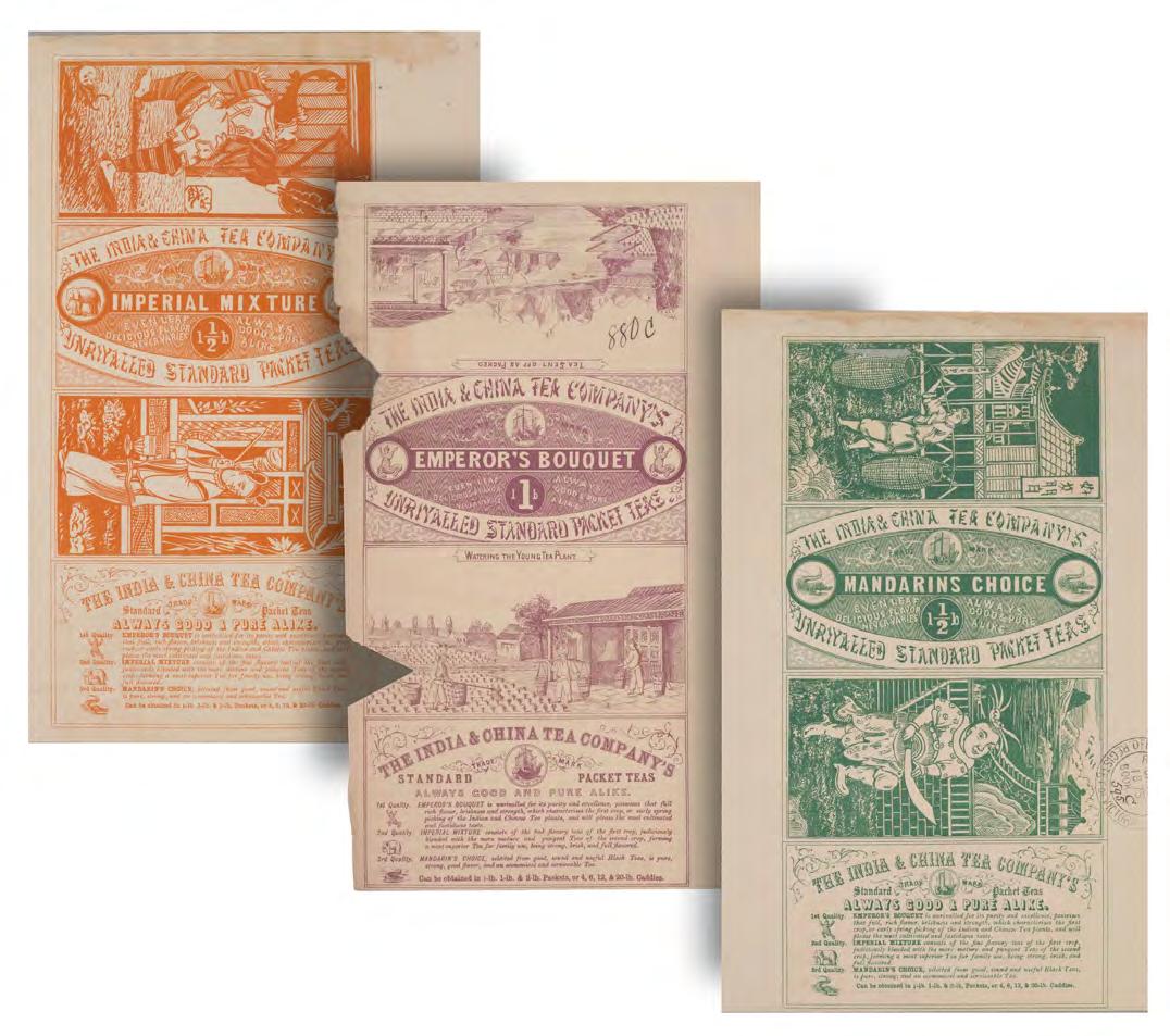 Labels for The India & China Tea Company’s Unrivalled Standard Packet Teas, 1875, registered by James Price Goulstone, Victorian Patents Office Copyright Collection, State Library of Victoria.