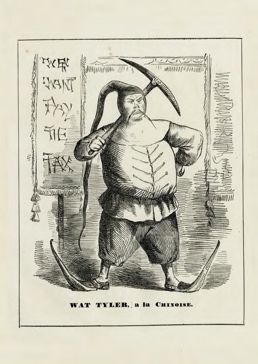 One of the earliest examples I found is an 1859 woodengraved caricature titled “Wat Tyler, a la Chinoise,” published in Melbourne Punch Melbourne Punch was renowned for its distinctive satire and commentary on social, economic and political issues, presented in various formats, from articles and sketches to humorous and satirical writing, verse, jokes and cartoons.2