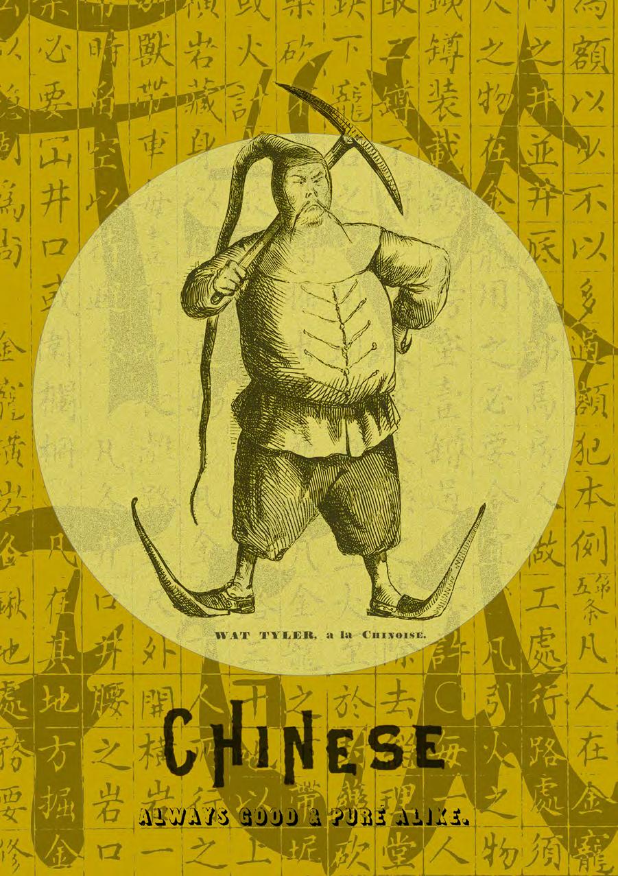 At the bottom, the text is composed of two elements: the word “Chinese”, taken from a Chinese immigrants’ advertisement in 1874, and a promotional phrase from Oriental Tea packaging, “Always Good & Pure Alike.” The phrase is reinterpreted to suggest the fine qualities of Chinese immigrants. The background features translated official announcements of prohibitions targeting Chinese miners, alongside chop-suey-like typefaces in the words “Tax” and “Tea.” Through digital manipulation, these texts become largely illegible, functioning instead as a textured pattern that evokes cultural memory without relying on readability.