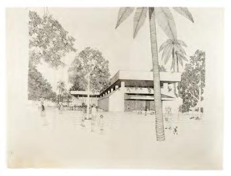 Joyce and Nankivell’s first chancery design was for a straightforward block with blade columns and a curtain wall, again in rmit ’s collection. This resembled the single-block chancery developed for Jakarta-Menteng, Indonesia (1961–67, replaced), but now incorporated a “Kuala Lumpur plan” developed c.1966 by Clive Wade of the Commonwealth Department of Works (CDW),22 and applied in Godfrey and Spowers’ Singapore Chancery (1976) and in Bangkok’s Australian Embassy, by Ancher, Mortlock, Murray and Woolley (1980).23 Wade’s plan incorporated a “great hall,” a greatly enlarged foyer space that could serve as a large exhibition gallery in Kuala Lumpur. This was quickly supplanted by Joyce and Nankivell’s final L-shaped plan, dominant in later 1974, that grouped the building around an extended patio and inset pond fronting its street, and set a projecting wing above a large foyer exhibition space